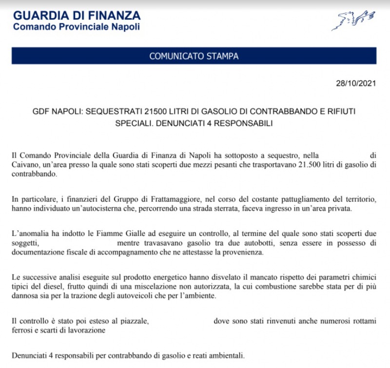 "GDF NAPOLI: SEQUESTRATI 21500 LITRI DI GASOLIO DI CONTRABBANDO E RIFIUTI SPECIALI. DENUNCIATI 4 RESPONSABILI. Il Comando Provinciale della Guardia di Finanza di Napoli ha sottoposto a sequestro, nella ... di Caivano, un’area presso la quale- si legge nella nota- sono stati scoperti due mezzi pesanti che trasportavano 21.500 litri di gasolio di contrabbando. In particolare, i finanzieri del Gruppo di Frattamaggiore, nel corso del costante pattugliamento del territorio, hanno individuato un’autocisterna che, percorrendo una strada sterrata, faceva ingresso in un’area privata. L’anomalia ha indotto le Fiamme Gialle ad eseguire un controllo, al termine del quale sono stati scoperti due soggetti, ... mentre travasavano gasolio tra due autobotti, senza essere in possesso di documentazione fiscale di accompagnamento che ne attestasse la provenienza. Le successive analisi eseguite sul prodotto energetico hanno disvelato il mancato rispetto dei parametri chimici tipici del diesel, frutto quindi di una miscelazione non autorizzata, la cui combustione sarebbe stata per di più dannosa sia per la trazione degli autoveicoli che- si legge nella nota- per l’ambiente. Il controllo è stato poi esteso al piazzale, ... dove sono stati rinvenuti anche numerosi rottami ferrosi e scarti di lavorazione ... Denunciati 4 responsabili per contrabbando di gasolio e reati ambientali."