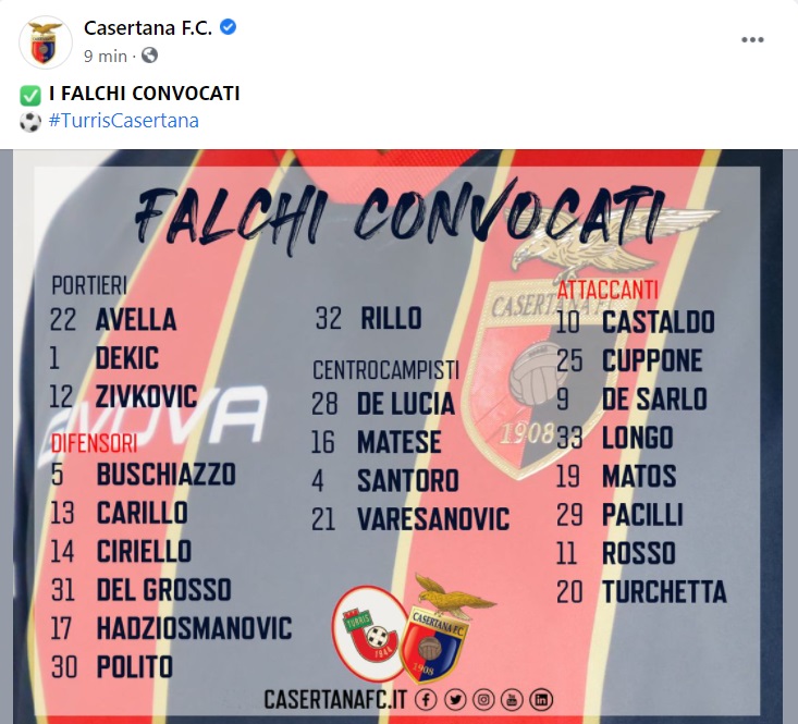Questi i convocati della Casertana per il match di domani contro la Turris: