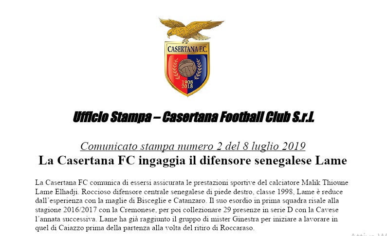 Questo il comunicato inviatoci dall'Ufficio Stampa della Casertana.
