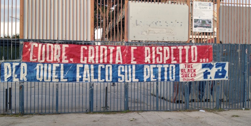 "Cuore, grinta e rispetto per quel falco sul petto" E' questo il testo dello striscione che i tifosi della Casertana hanno affisso questo pomeriggio ai cancelli dello stadio Pinto. La squadra, prima della partenza per il ritiro, ha avuto l'occasione di leggere l'incitamento della curva in vista della partita contro la Cavese in programma domani alle 17.30. I falchetti sono alla ricerca di tre punti preziosi per la classifica e per il morale.