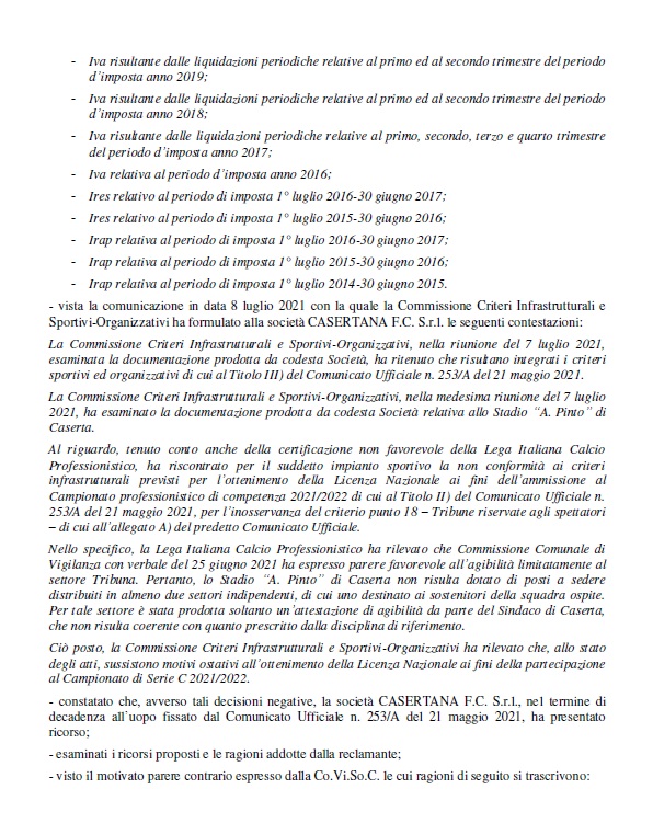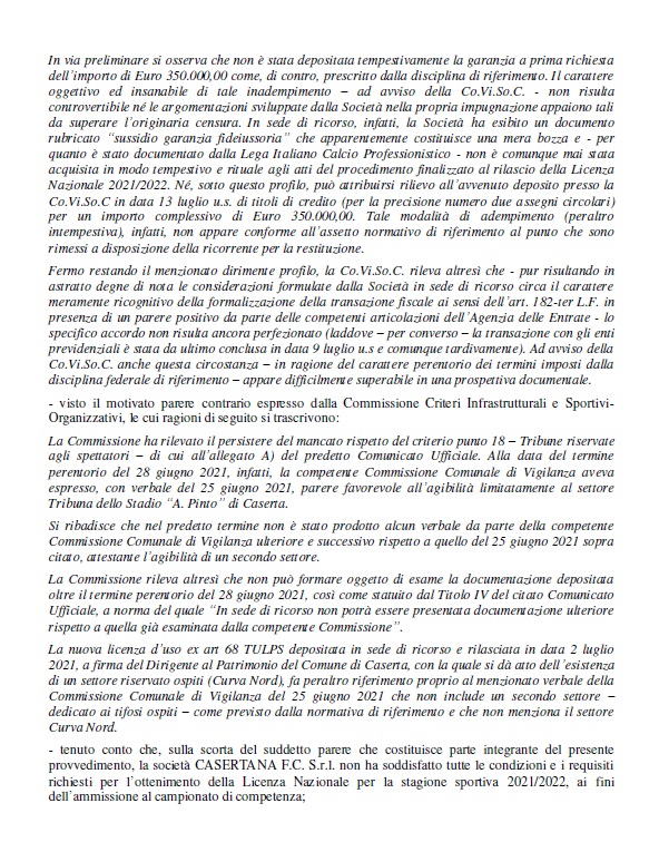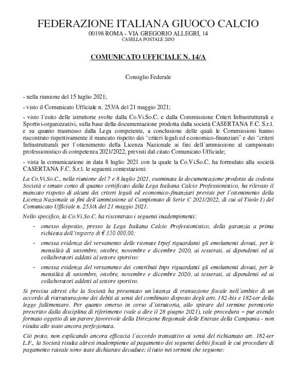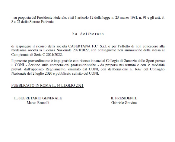 Questo il comunicato della FIGC sull'esclusione della Casertana: