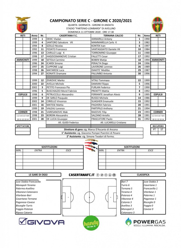 Queste le formazioni ufficiali di Casertana-Ternana: