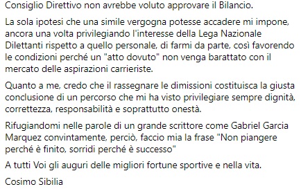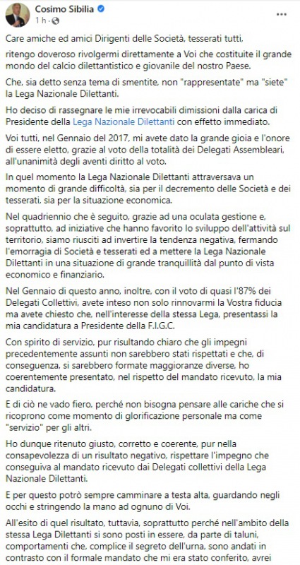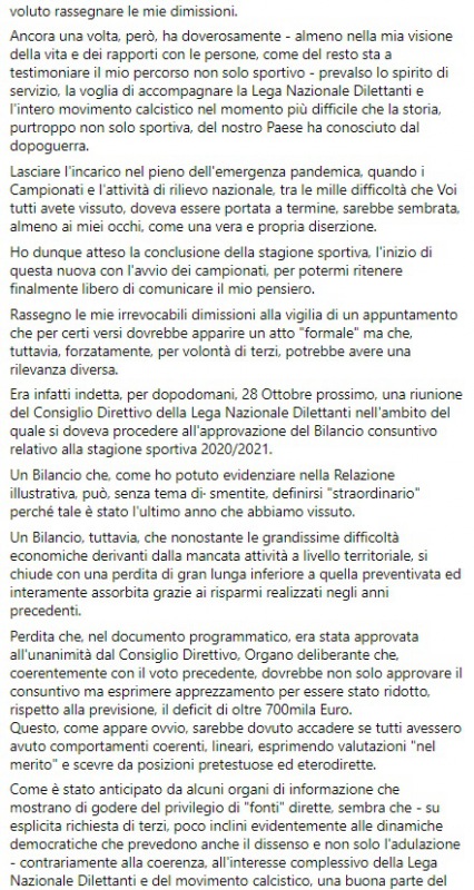 "Care amiche ed amici Dirigenti delle Società, tesserati tutti, ritengo doveroso rivolgermi direttamente a Voi che costituite il grande mondo del calcio dilettantistico e giovanile del nostro Paese. Che, sia detto senza tema di smentite, non "rappresentate" ma "siete" la Lega Nazionale Dilettanti. Ho deciso- si legge nella nota- di rassegnare le mie irrevocabili dimissioni dalla carica di Presidente della Lega Nazionale Dilettanti con effetto immediato. Voi tutti, nel Gennaio del 2017, mi avete dato la grande gioia e l'onore di essere eletto, grazie al voto della totalità dei Delegati Assembleari, all'unanimità degli aventi diritto al voto. In quel momento la Lega Nazionale Dilettanti attraversava un momento di grande difficoltà, sia per il decremento delle Società e dei tesserati, sia per la situazione economica. Nel quadriennio che è seguito, grazie ad una oculata gestione e, soprattutto, ad iniziative che hanno favorito lo sviluppo dell'attività sul territorio, siamo riusciti ad invertire la tendenza negativa, fermando l'emorragia di Società e tesserati ed a mettere la Lega Nazionale Dilettanti in una situazione di grande tranquillità dal punto di vista economico e finanziario. Nel Gennaio di questo anno, inoltre, con il voto di quasi l'87% dei Delegati Collettivi, avete inteso non solo rinnovarmi la Vostra fiducia ma avete chiesto che, nell'interesse della stessa Lega, presentassi la mia candidatura a Presidente della F.I.G.C. Con spirito di servizio, pur risultando chiaro che gli impegni precedentemente assunti non sarebbero stati rispettati e che, di conseguenza, si sarebbero formate maggioranze diverse, ho coerentemente presentato, nel rispetto del mandato ricevuto, la mia candidatura. E di ciò ne vado fiero, perché non bisogna pensare alle cariche che si ricoprono come momento di glorificazione personale ma come "servizio" per gli altri. Ho dunque ritenuto giusto, corretto e coerente, pur nella consapevolezza di un risultato negativo, rispettare l'impegno che conseguiva al mandato ricevuto dai Delegati collettivi della Lega Nazionale Dilettanti. E per questo potrò sempre camminare a testa alta, guardando negli occhi e stringendo la mano ad ognuno di Voi. All'esito di quel risultato, tuttavia, soprattutto perché nell'ambito della stessa Lega Dilettanti si sono posti in essere, da parte di taluni, comportamenti che, complice il segreto dell'urna, sono andati in contrasto con il formale mandato che mi era stato conferito, avrei voluto rassegnare le mie dimissioni. Ancora una volta, però, ha doverosamente - almeno nella mia visione della vita e dei rapporti con le persone, come del resto sta a testimoniare il mio percorso non solo sportivo - prevalso lo spirito di servizio, la voglia di accompagnare la Lega Nazionale Dilettanti e l'intero movimento calcistico nel momento più difficile che la storia, purtroppo non solo sportiva, del nostro Paese ha conosciuto dal dopoguerra. Lasciare l'incarico nel pieno dell'emergenza pandemica, quando i Campionati e l'attività di rilievo nazionale, tra le mille difficoltà che Voi tutti avete vissuto, doveva essere portata a termine, sarebbe sembrata, almeno ai miei occhi, come una vera e propria diserzione. Ho dunque atteso- si legge nella nota- la conclusione della stagione sportiva, l'inizio di questa nuova con l'avvio dei campionati, per potermi ritenere finalmente libero di comunicare il mio pensiero. Rassegno le mie irrevocabili dimissioni alla vigilia di un appuntamento che per certi versi dovrebbe apparire un atto "formale" ma che, tuttavia, forzatamente, per volontà di terzi, potrebbe avere una rilevanza diversa. Era infatti indetta, per dopodomani, 28 Ottobre prossimo, una riunione del Consiglio Direttivo della Lega Nazionale Dilettanti nell'ambito del quale si doveva procedere all'approvazione del Bilancio consuntivo relativo alla stagione sportiva 2020/2021. Un Bilancio che, come ho potuto evidenziare nella Relazione illustrativa, può, senza tema di· smentite, definirsi "straordinario" perché tale è stato l'ultimo anno che abbiamo vissuto. Un Bilancio, tuttavia, che nonostante le grandissime difficoltà economiche derivanti dalla mancata attività a livello territoriale, si chiude con una perdita di gran lunga inferiore a quella preventivata ed interamente assorbita grazie ai risparmi realizzati negli anni precedenti. Perdita che, nel documento programmatico, era stata approvata all'unanimità dal Consiglio Direttivo, Organo deliberante che, coerentemente con il voto precedente, dovrebbe non solo approvare il consuntivo ma esprimere apprezzamento per essere stato ridotto, rispetto alla previsione, il deficit di oltre 700mila Euro. Questo, come appare ovvio, sarebbe dovuto accadere se tutti avessero avuto comportamenti coerenti, lineari, esprimendo valutazioni "nel merito" e scevre da posizioni pretestuose ed eterodirette. Come è stato anticipato- si legge nella nota- da alcuni organi di informazione che mostrano di godere del privilegio di "fonti" dirette, sembra che - su esplicita richiesta di terzi, poco inclini evidentemente alle dinamiche democratiche che prevedono anche il dissenso e non solo l'adulazione - contrariamente alla coerenza, all'interesse complessivo della Lega Nazionale Dilettanti e del movimento calcistico, una buona parte del Consiglio Direttivo non avrebbe voluto approvare il Bilancio. La sola ipotesi che una simile vergogna potesse accadere mi impone, ancora una volta privilegiando l'interesse della Lega Nazionale Dilettanti rispetto a quello personale, di farmi da parte, così favorendo le condizioni perché un "atto dovuto" non venga barattato con il mercato delle aspirazioni carrieriste. Quanto a me, credo che il rassegnare le dimissioni costituisca la giusta conclusione di un percorso che mi ha visto privilegiare sempre dignità, correttezza, responsabilità e soprattutto onestà. Rifugiandomi nelle parole di un grande scrittore come Gabriel Garcia Marquez convintamente, perciò, faccio mia