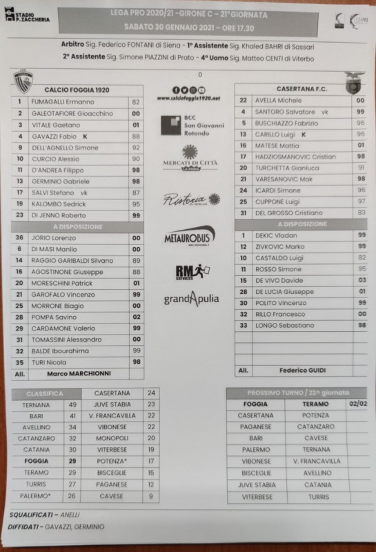 Queste le formazioni scelte dai tecnici del Foggia Marchionni e della Casertana Guidi
