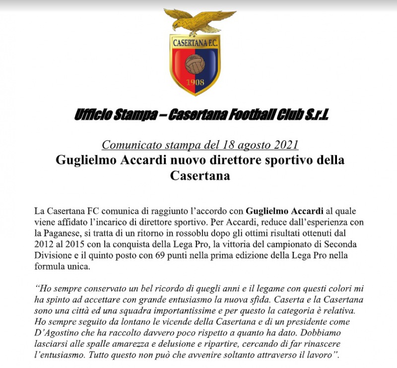 "Guglielmo Accardi nuovo direttore sportivo della Casertana. La Casertana FC comunica di raggiunto l’accordo con Guglielmo Accardi al quale viene affidato l’incarico di direttore sportivo. Per Accardi, reduce dall’esperienza con la Paganese, si tratta- si legge nella nota- di un ritorno in rossoblu dopo gli ottimi risultati ottenuti dal 2012 al 2015 con la conquista della Lega Pro, la vittoria del campionato di Seconda Divisione e il quinto posto con 69 punti nella prima edizione della Lega Pro nella formula unica. “Ho sempre conservato un bel ricordo di quegli anni e il legame con questi colori mi ha spinto ad accettare con grande entusiasmo la nuova sfida. Caserta e la Casertana sono una città ed una squadra importantissime e per questo la categoria è relativa. Ho sempre seguito da lontano le vicende della Casertana e di un presidente come D’Agostino che ha raccolto davvero poco rispetto a quanto ha dato. Dobbiamo lasciarsi alle spalle amarezza e delusione e ripartire, cercando- si legge nella nota- di far rinascere l’entusiasmo. Tutto questo non può che avvenire soltanto attraverso il lavoro”."