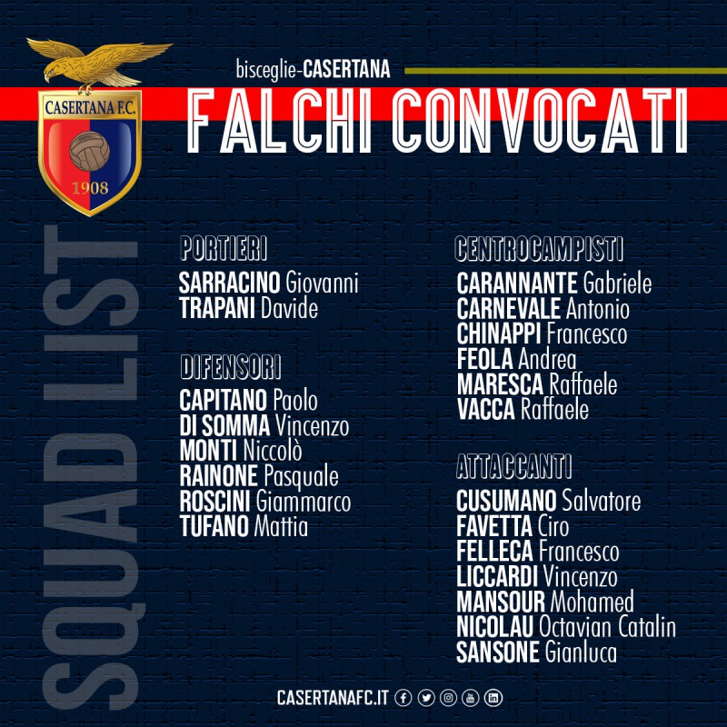 Questi i giocatori convocati dall'allenatore Maiuri in vista della gara del turno infrasettimanale di Bisceglie-Caserta.