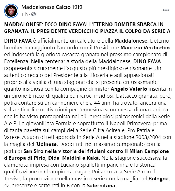Questo quanto pubblicato sulla pagina facebook della Maddalonese Calcio: "Maddalonese: ecco Dino Fava! L'eterno bomber sbarca in granata. Il presidente Verdicchio piazza il colpo da serie A Dino Fava è ufficialmente un calciatore della Maddalonese. L’eterno bomber ha raggiunto l’accordo con il Presidente Maurizio Verdicchio - si legge nella nota - ed indosserà la gloriosa casacca granata nel prossimo campionato di Eccellenza. Nella centenaria storia della Maddalonese, Dino Fava rappresenta sicuramente l’acquisto più prestigioso e risonante. Un autentico regalo del Presidente alla tifoseria e agli appassionati proprio alla vigilia di una stagione che si presenta entusiasmante quanto insidiosa con la compagine di mister Angelo Valerio inserita in un girone B ricco di qualità ed incroci insidiosi. L’attacco granata, però, potrà contare su un cannoniere che a 44 anni ha trovato, ancora una volta - si legge nella nota -, stimoli e motivazioni per l’ennesima scommessa di una carriera che lo ha visto protagonista nei più prestigiosi palcoscenici della Serie A e B. Le giovanili tra Formia e soprattutto il Napoli Primavera, prima di tanta gavetta sui campi della Serie C tra Acireale, Pro Patria e Varese. A suon di reti approda in Serie A nella stagione 2003/2004 con la maglia dell’Udinese. Dodici reti nel massimo campionato con la perla di San Siro nella vittoria dei friulani contro il Milan Campione d'Europa di Pirlo, Dida, Maldini e Kakà. Nella stagione successiva la clamorosa impresa con Luciano Spalletti in panchina e la storica qualificazione in Champions League. Poi - si legge nella nota - ancora la Serie A con il Treviso, la promozione nella massima serie con la maglia del Bologna, 42 presenze e sette reti in B con la Salernitana"