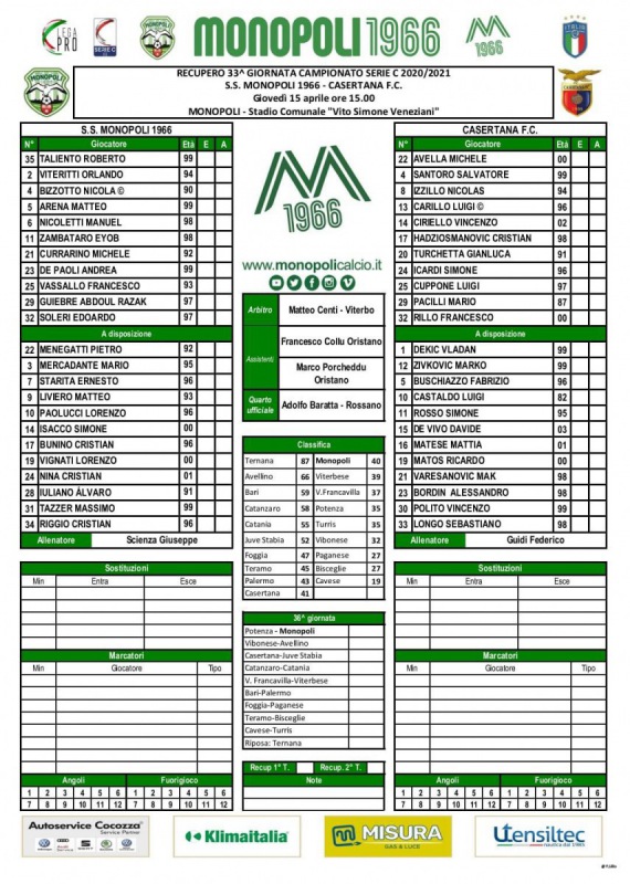 Queste le formazioni che scenderanno in campo per il match tra Monopoli e Casertana