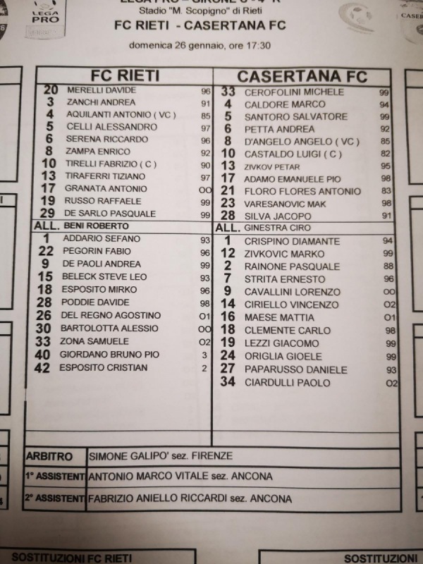 Queste le formazioni di Rieti e Casertana