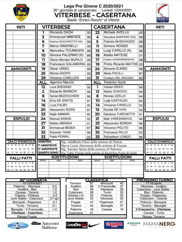 Queste le formazioni di Viterbese e Casertana in campo alle ore 21