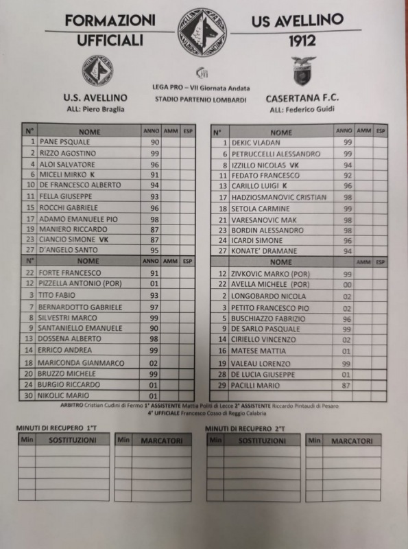 Queste le formazioni ufficiali di Avellino-Casertana: