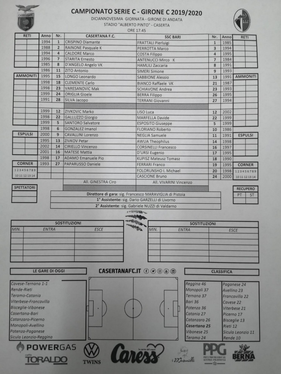 Queste le formazioni ufficiali di Casertana-Bari:
