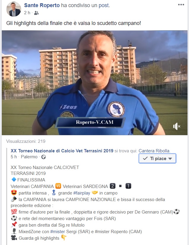 Questo quanto apprendiamo dal profilo Facebook del giornalista e scrittore Sante Roperto, in questo caso in veste di allenatore della rappresentativa calcistica dei veterinari.