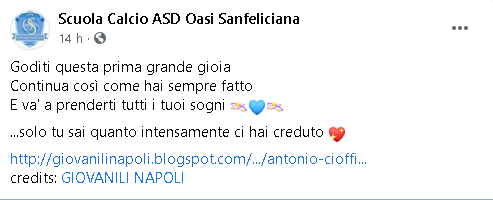 Il giovanissimo Antonio Cioffi, cresciuto a San Felice a Cancello, in provincia di Caserta ed esploso calcisticamente nell’Oasi Sanfeliciana, ha ricevuto nelle scorse ore, la lietissima notizia della sua convocazione nella prima squadra del Napoli di Mister Gattuso. Congratulazioni.