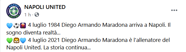 Questo il post pubblicato sulla pagina Facebook del Napoli United: "4 luglio 1984 Diego Armando Maradona arriva a Napoli. Il sogno diventa realtà... 4 luglio 2021 - si legge nel post - Diego Armando Maradona è l'allenatore del Napoli United. La storia continua"...