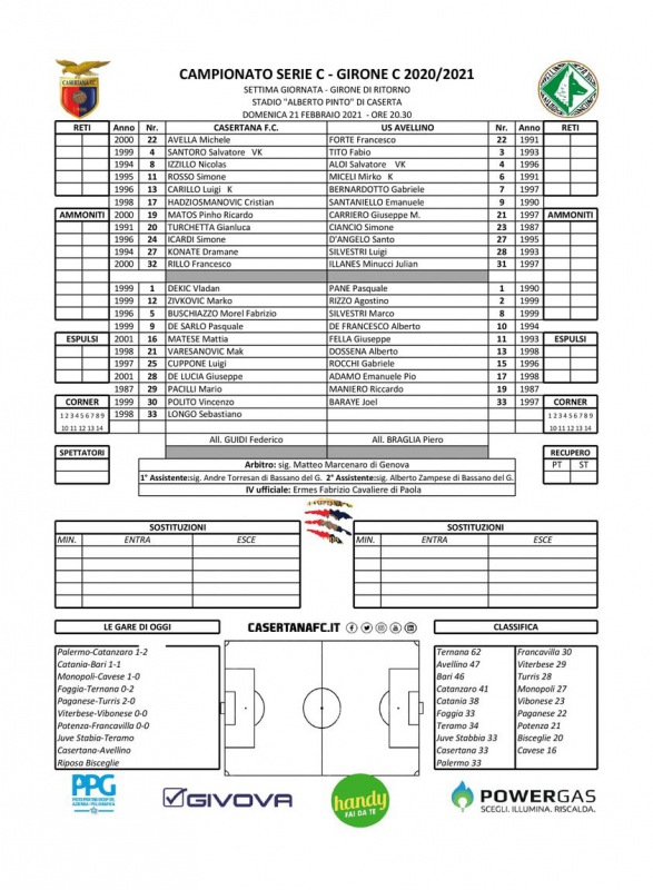 Queste le formazioni ufficiali di Casertana-Avellino: