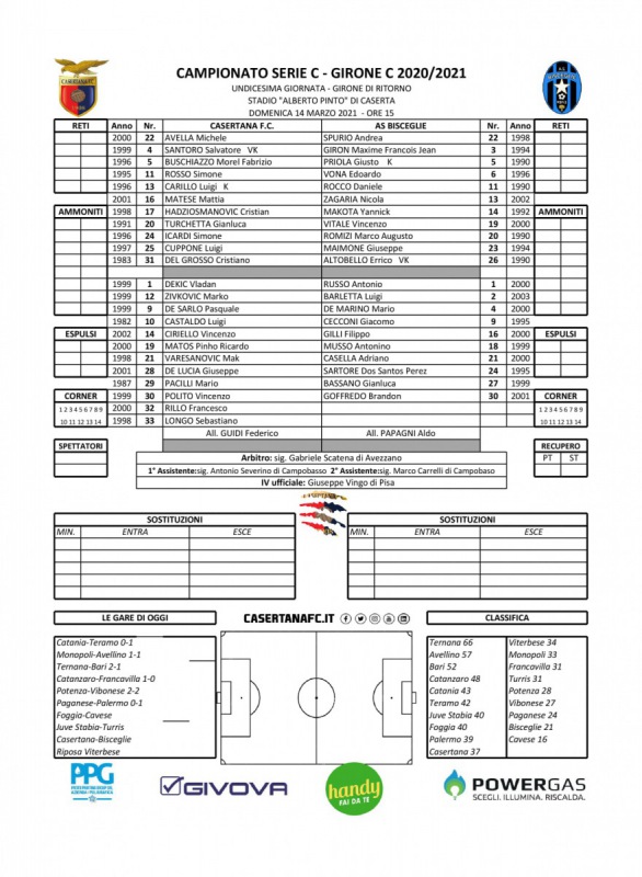 Queste le formazioni ufficiali di Casertana-Bisceglie:
