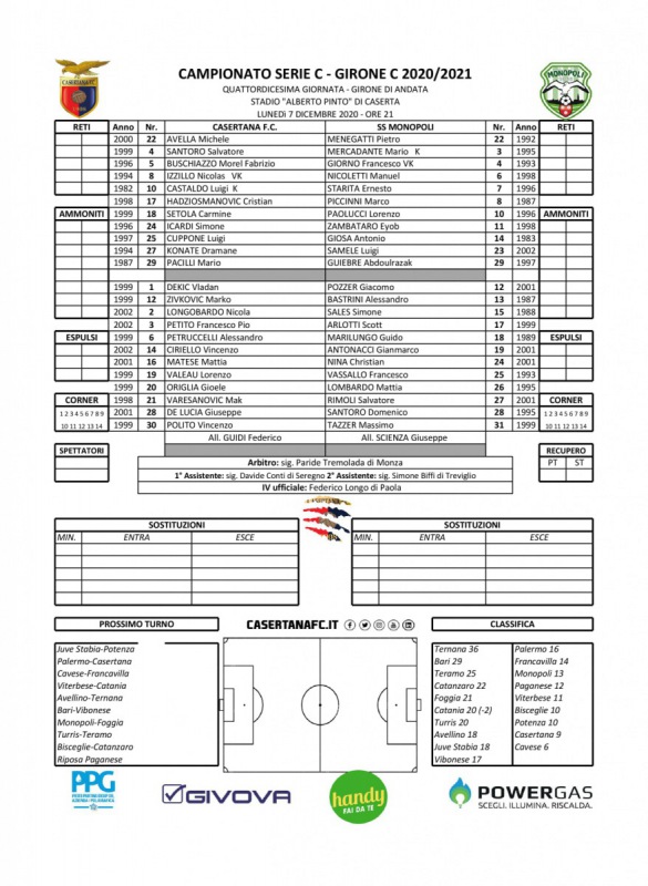 Queste le formazioni ufficiali di Casertana-Monopoli: