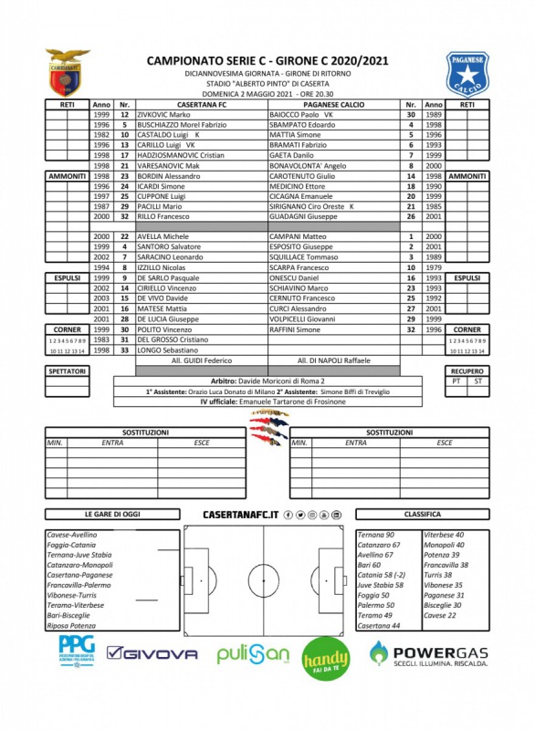 Queste le formazioni ufficiali di Casertana-Paganese: