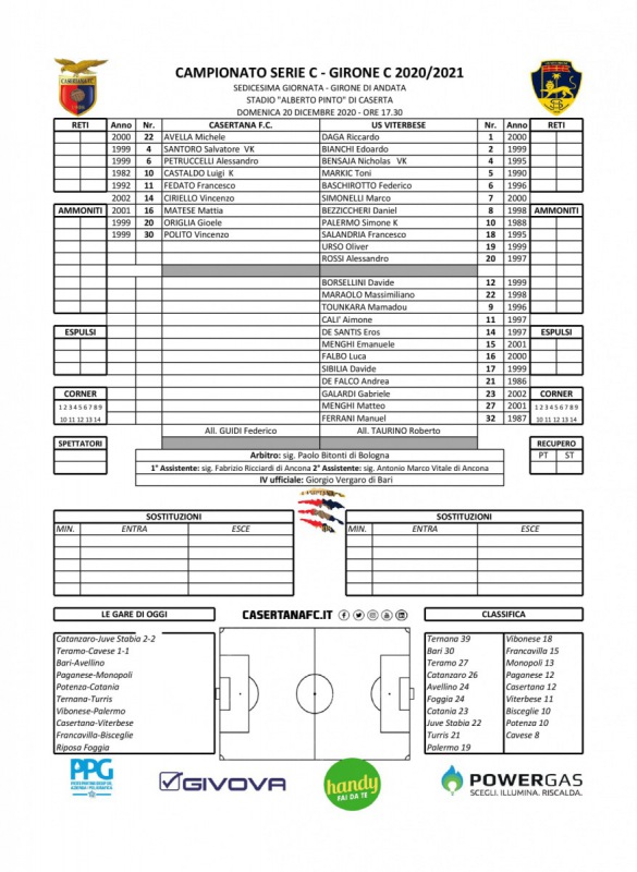 Queste le formazioni ufficiali di Casertana-Viterbese: