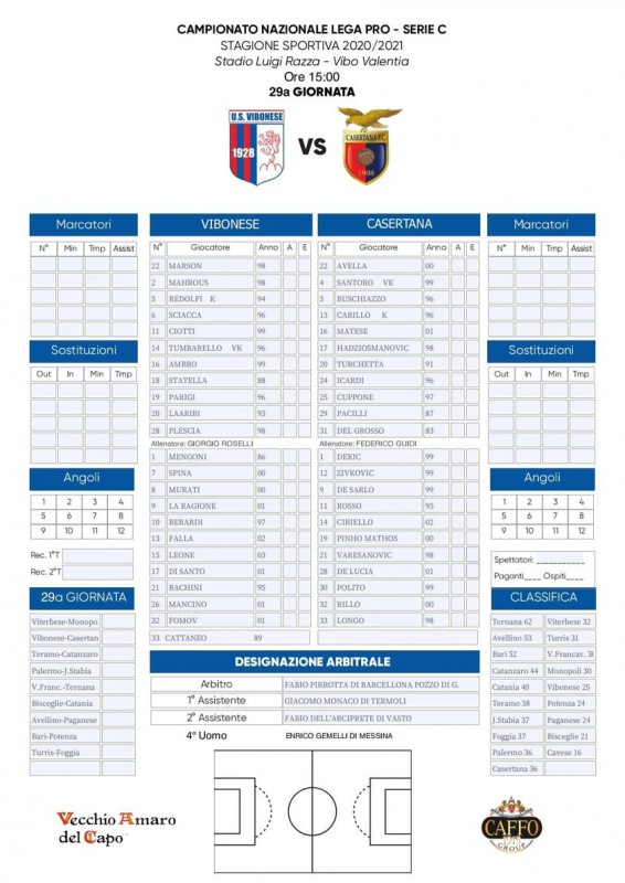 Queste le formazioni ufficiali di Vibonese-Casertana: