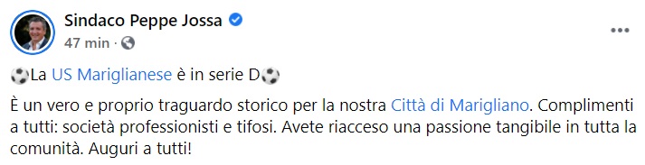 Questo quanto pubblicato sulla pagina fb del Sindaco Jossa: "La US Mariglianese è in serie D È un vero e proprio traguardo storico per la nostra Città di Marigliano. Complimenti a tutti: società professionisti e tifosi. Avete riacceso una passione tangibile in tutta la comunità. Auguri a tutti!"