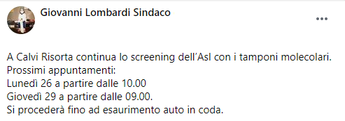 Questo il post pubblicato dal Sindaco di Calvi Risorta Giovanni Lombardi sulla sua pagina Facebook: "A Calvi Risorta continua lo screening dell’Asl con i tamponi molecolari. Prossimi appuntamenti- si legge nel post - Lunedì 26 a partire dalle 10.00 Giovedì 29 a partire dalle 09.00. Si procederà - conclude il post - fino ad esaurimento auto in coda".