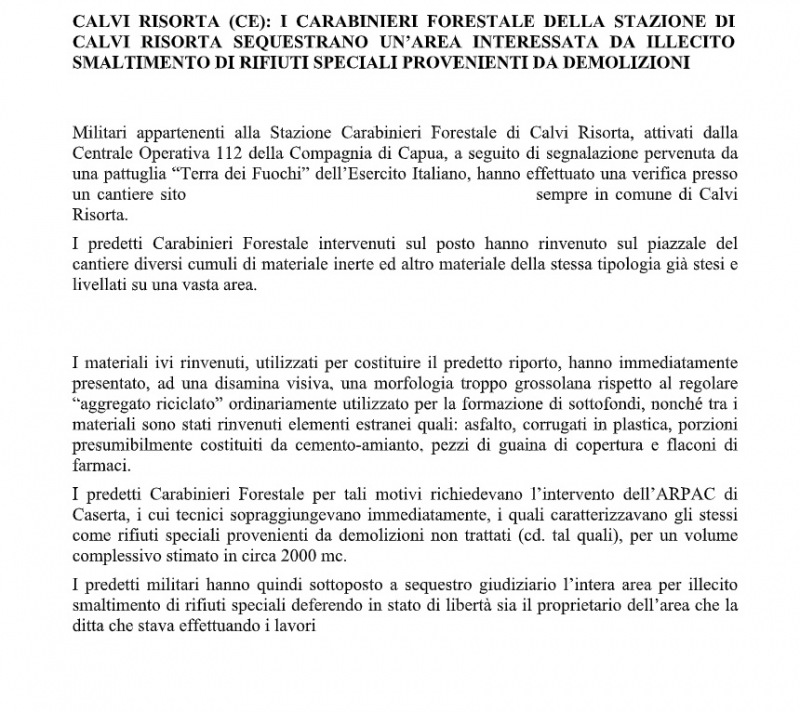 Questa parte della nota stampa del Comando Provinciale Carabinieri di Caserta: