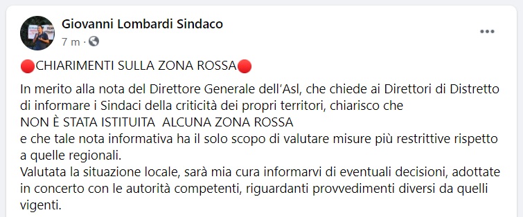 Questo quanto apprediamo dalla pagina facebook del Sindaco di Calvi Risorta: "CHIARIMENTI SULLA ZONA ROSSA In merito alla nota del Direttore Generale dell’Asl, che chiede ai Direttori di Distretto di informare i Sindaci della criticità dei propri territori - si legge nella nota -, chiarisco che NON È STATA ISTITUITA ALCUNA ZONA ROSSA e che tale nota informativa ha il solo scopo di valutare misure più restrittive rispetto a quelle regionali. Valutata la situazione locale, sarà mia cura informarvi di eventuali decisioni - si legge nella nota -, adottate in concerto con le autorità competenti, riguardanti provvedimenti diversi da quelli vigenti."