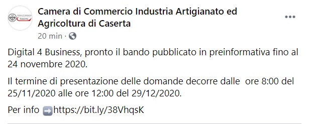 La Camera di Commercio di Caserta intende avviare un intervento straordinario rivolto alle micro e piccole imprese e finalizzato a sostenere, mediante contributi per l’adozione di tecnologie e strumenti informatici e digitali la loro capacità di risposta all’emergenza Covid-19 e di miglioramento dei processi aziendali. Questo quanto apprendiamo dalla pagina facebook della Camera di Commercio di Caserta: