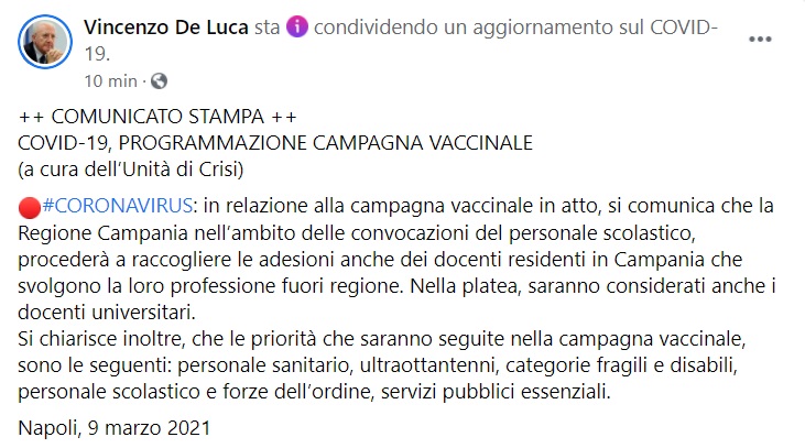 "#CORONAVIRUS: in relazione alla campagna vaccinale in atto, si comunica che la Regione Campania nell’ambito delle convocazioni del personale scolastico, procederà a raccogliere le adesioni anche dei docenti residenti in Campania che svolgono la loro professione fuori regione. -Si legge nella nota- Nella platea, saranno considerati anche i docenti universitari. Si chiarisce inoltre, che le priorità che saranno seguite nella campagna vaccinale, sono le seguenti: personale sanitario, ultraottantenni, categorie fragili e disabili, personale scolastico e forze dell’ordine, servizi pubblici essenziali."