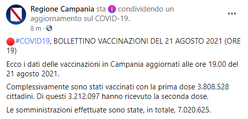 Questo parte del post pubblicato sulla pagina Facebook 'Regione Campania' : "Covid-19. BOLLETTINO VACCINAZIONI DEL 21 AGOSTO 2021 (ORE 19) Ecco i dati delle vaccinazioni in Campania aggiornati alle ore 19.00 del 21 agosto 2021. Complessivamente - si legge nel post - sono stati vaccinati con la prima dose 3.808.528 cittadini. Di questi 3.212.097 hanno ricevuto la seconda dose. Le somministrazioni effettuate - conclude il post - sono state, in totale, 7.020.625 (...)".
