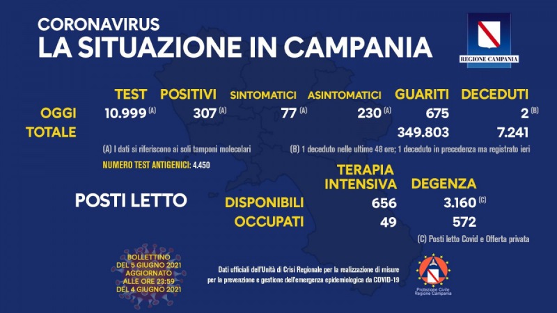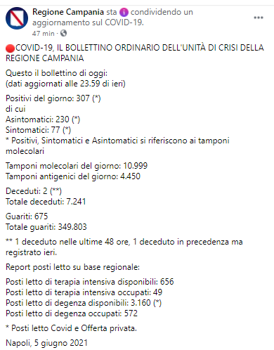 Questo il post pubblicato sulla pagina Facebook 'Regione Campania': Covid-19, il bollettino ordinario dell'unità di crisi della Regione Campania. Questo il bollettino di oggi - si legge nel post - (dati aggiornati alle 23.59 di ieri). Positivi del giorno: 307 (*) di cui