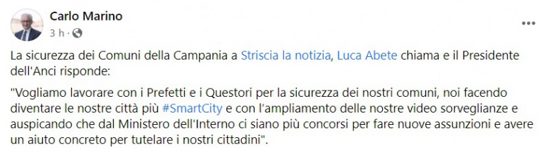 "La sicurezza dei Comuni della Campania a Striscia la notizia, Luca Abete chiama e il Presidente dell'Anci risponde: "Vogliamo lavorare con i Prefetti e i Questori per la sicurezza dei nostri comuni, noi facendo diventare le nostre città più #SmartCity e con l’ampliamento delle nostre video sorveglianze e auspicando che dal Ministero dell'Interno ci siano più concorsi per fare nuove assunzioni e avere un aiuto concreto per tutelare i nostri cittadini"."
