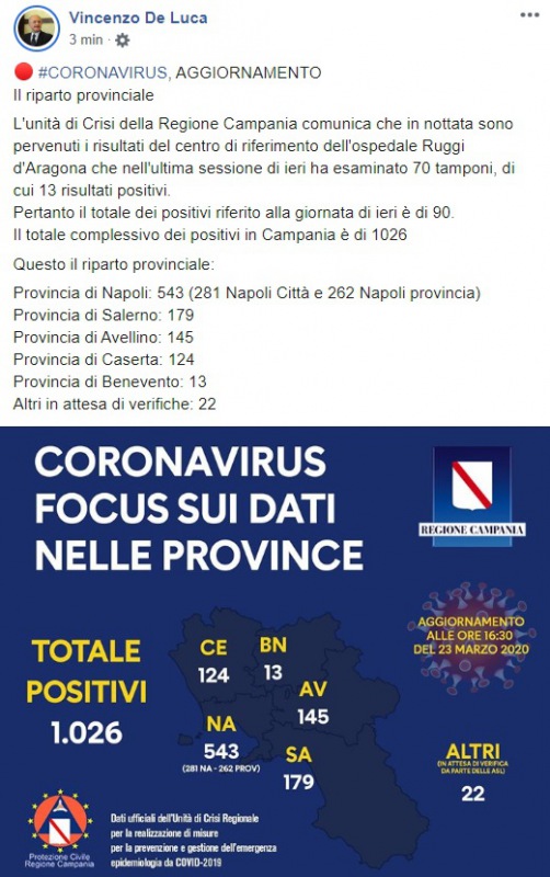 Questo quanto pubblicato sulla pagina facebook del Pres. Vincenzo De Luca: