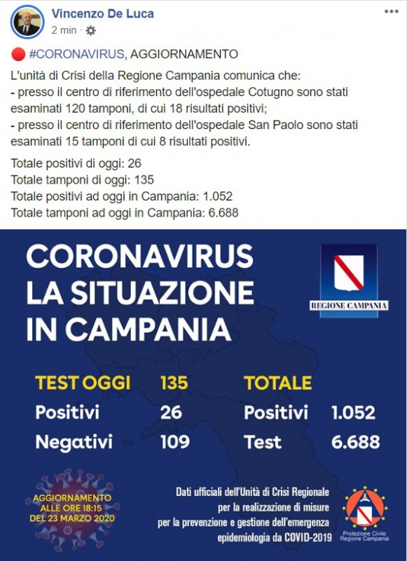 Questo quanto pubblicato sulla pagina facebook del Pres. De Luca: