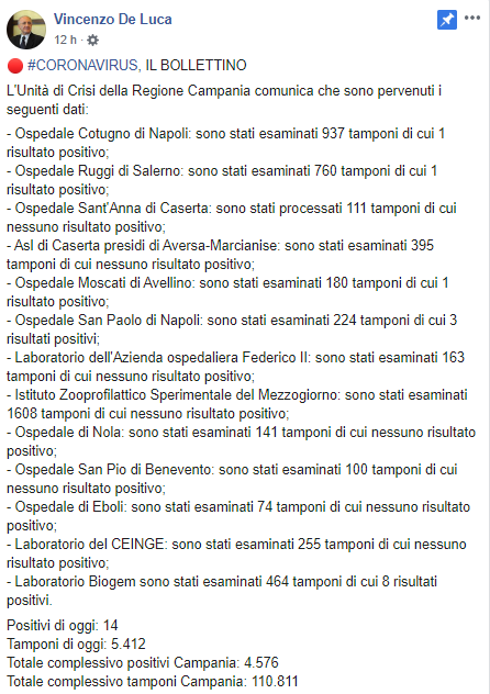 Questo il post pubblicato su Facebook dal Presidente della Regione Campania Vincenzo De Luca: