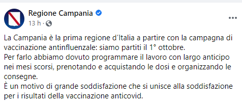 Questo il post pubblicato sulla pagina Facebook 'Regione Campania': "La Campania è la prima regione d’Italia a partire con la campagna di vaccinazione antinfluenzale: siamo partiti il 1° ottobre. Per farlo - si legge nel post - abbiamo dovuto programmare il lavoro con largo anticipo nei mesi scorsi, prenotando e acquistando le dosi e organizzando le consegne. È un motivo di grande soddisfazione - prosegue il post - che si unisce alla soddisfazione per i risultati della vaccinazione anticovid".