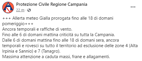 Questo il post pubblicato sulla pagina Facebook 'Protezione Civile Regione Campania': "Allerta meteo Gialla prorogata fino alle 18 di domani pomeriggio. Ancora temporali e raffiche di vento. Fino alle 6 di domani mattina criticità su tutta la Campania. Dalle 6 di domani mattina - si legge nel post - fino alle 18 di domani sera, ancora temporali e rovesci su tutto il territorio ad esclusione delle zone 4 (Alta Irpinia e Sannio) e 7 (Tanagro). Massima attenzione a caduta massi, frane e allagamenti".