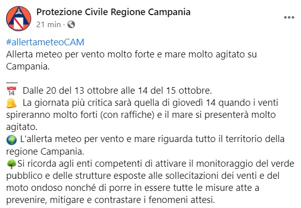 Questo quanto apprendiamo dalla pagina fb della Prot. Civile Campania: "Allerta meteo per vento molto forte e mare molto agitato su Campania. Dalle 20 del 13 ottobre alle 14 del 15 ottobre. La giornata più critica sarà quella di giovedì 14 quando i venti spireranno molto forti (con raffiche) e il mare si presenterà molto agitato. L'allerta meteo per vento e mare riguarda tutto il territorio della regione Campania. Si ricorda agli enti competenti di attivare il monitoraggio del verde pubblico e delle strutture esposte alle sollecitazioni dei venti e del moto ondoso nonché di porre in essere tutte le misure atte a prevenire, mitigare e contrastare i fenomeni attesi."