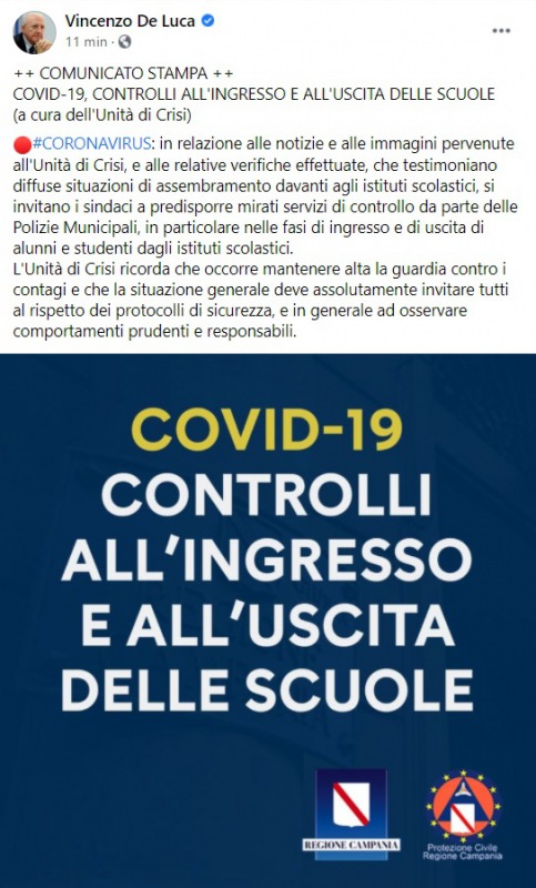 Questo quanto pubblicato sulla pagina facebook del Pres. De Luca:
