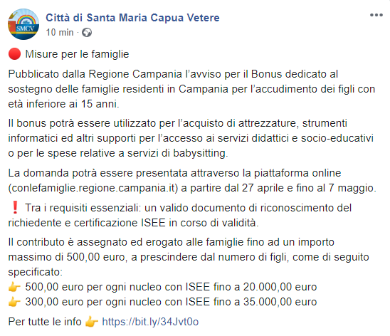 Questo il post pubblicato sulla pagina Facebook "Città di Santa Maria Capua Vetere":