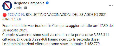 Questo parte del post pubblicato sulla pagina Facebook 'Regione Campania': "Covid-19, BOLLETTINO VACCINAZIONI DEL 28 AGOSTO 2021 (ORE 17.30). Ecco i dati delle vaccinazioni in Campania aggiornati alle ore 17.30 del 28 agosto 2021. Complessivamente - si legge nel post - sono stati vaccinati con la prima dose 3.863.311 cittadini. Di questi 3.299.468 hanno ricevuto la seconda dose. Le somministrazioni effettuate sono state, in totale, 7.162.779 (...)".