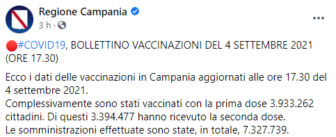Questo parte del post pubblicato sulla pagina Facebook 'Regione Campania': "Covid-19, BOLLETTINO VACCINAZIONI DEL 4 SETTEMBRE 2021 (ORE 17.30) Ecco i dati delle vaccinazioni in Campania aggiornati alle ore 17.30 del 4 settembre 2021. Complessivamente sono stati vaccinati con la prima dose 3.933.262 cittadini. Di questi 3.394.477 - si legge nel post - hanno ricevuto la seconda dose. Le somministrazioni effettuate sono state, in totale, 7.327.739".