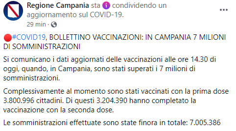 Questo parte del post pubblicato sulla pagina Facebook 'Regione Campania': "Covid-19, BOLLETTINO VACCINAZIONI: IN CAMPANIA 7 MILIONI DI SOMMINISTRAZIONI. Si comunicano i dati aggiornati - si legge nel post - delle vaccinazioni alle ore 14.30 di oggi, quando, in Campania, sono stati superati i 7 milioni di somministrazioni. Complessivamente al momento sono stati vaccinati con la prima dose 3.800.996 cittadini. Di questi 3.204.390 hanno completato la vaccinazione con la seconda dose. Le somministrazioni effettuate - conclude il post - sono state finora in totale: 7.005.386 (...)".