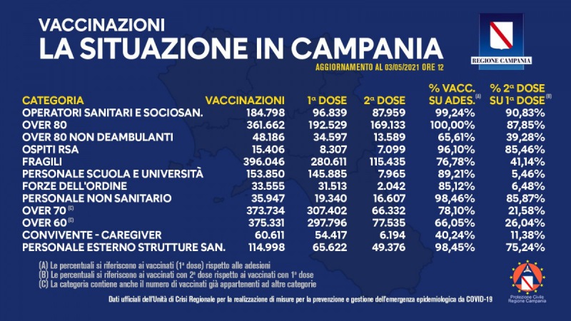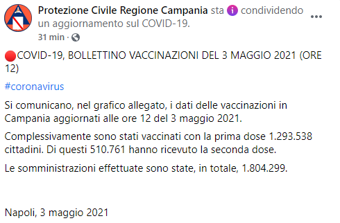 Questo il post pubblicato sulla pagina Facebook 'Protezione Civile Regione Campania': "Covid-19, bollettino vaccinazioni del 3 maggio 2021 (ore 12) Coronavirus. Si comunicano, nel grafico allegato, i dati delle vaccinazioni in Campania aggiornati alle ore 12 del 3 maggio 2021. Complessivamente - si legge nel post - sono stati vaccinati con la prima dose 1.293.538 cittadini. Di questi 510.761 hanno ricevuto la seconda dose. Le somministrazioni effettuate sono state - conclude il post - in totale, 1.804.299%u200B. Napoli, 3 maggio 2021".