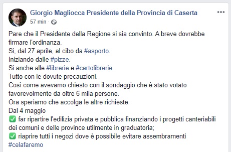Questo quanto pubblicato dal Pres. della Prov. di CE Magliocca