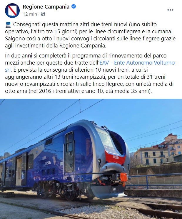 "Consegnati questa mattina altri due treni nuovi (uno subito operativo, l’altro tra 15 giorni) per le linee circumflegrea e la cumana. Salgono così a otto i nuovi convogli circolanti sulle linee flegree grazie agli investimenti della Regione Campania. -Si legge nella nota- In due anni si completerà il programma di rinnovamento del parco mezzi anche per queste due tratte dell'EAV - Ente Autonomo Volturno srl. -Si legge nella nota- È prevista la consegna di ulteriori 10 nuovi treni, a cui si aggiungeranno altri 13 treni revampizzati, per un totale di 31 treni nuovi o revampizzati circolanti sulle linee flegree, con un’età media di otto anni (nel 2016 i treni attivi erano 10, età media 35 anni)."
