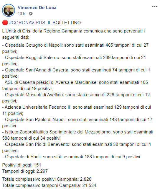 Questo il post pubblicato sulla pagina Facebook del governatore della Campania Vincenzo De Luca: