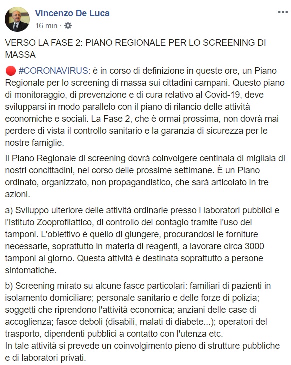 Questo quanto apprendiamo dalla apgina facebook del Pres. De Luca: